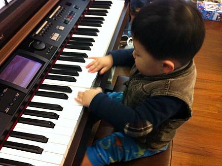 假日的早上, 虎虎喜歡坐在鋼琴上想像自己是個音樂家, 任意地在鍵盤上舞動他的雙手。胎教似乎真的有用, 瞧他有模有樣的!