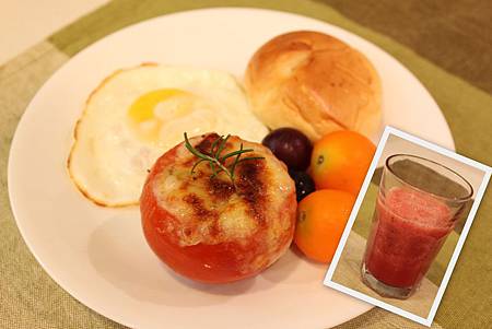 【今日早餐: 鮪魚焗烤牛番茄, 有塩餐包, 太陽蛋, 黃金番茄, 紫葡萄, 西瓜汁】