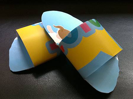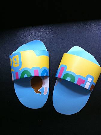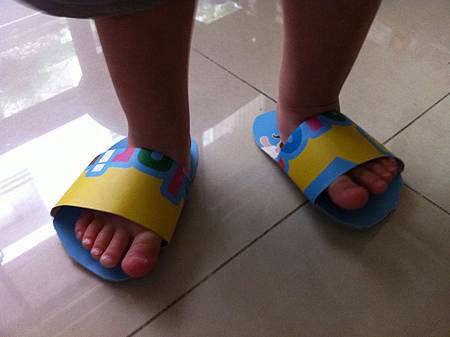 基於這樣的想法, 我想起小時候自己動手做的紙拖鞋, 穿上它時樂不可支的畫面。 其實, 我期待的是看見他穿上為自己量身訂作的紙拖鞋時, 會如何雀躍不已? 果真, 他像腳底有針似的, 跳個不停, 興奮喜樂全寫在臉上及四肢了。