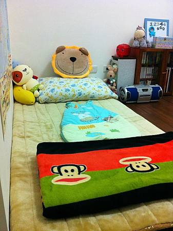 床墊上放的是小王子裝(睡袍)及阿嬤的愛心猴子毛毯。